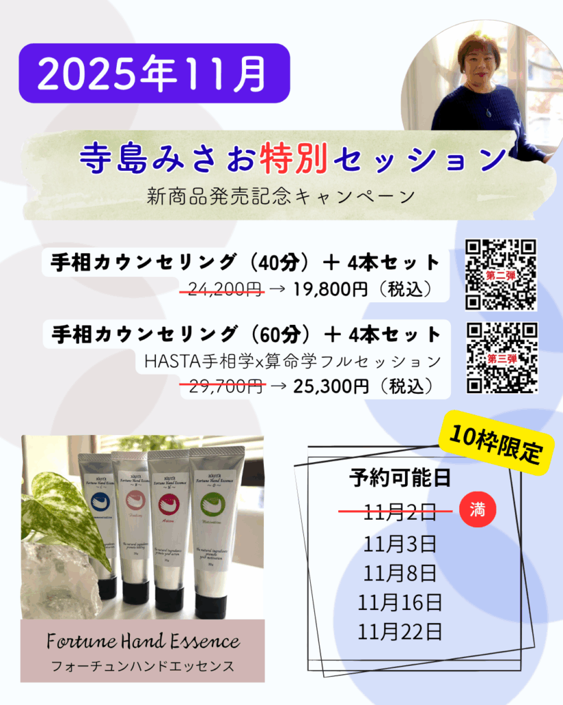 | HASTA®️カウンセリング(手相のみ) | 40分 | 税込11,000円 |