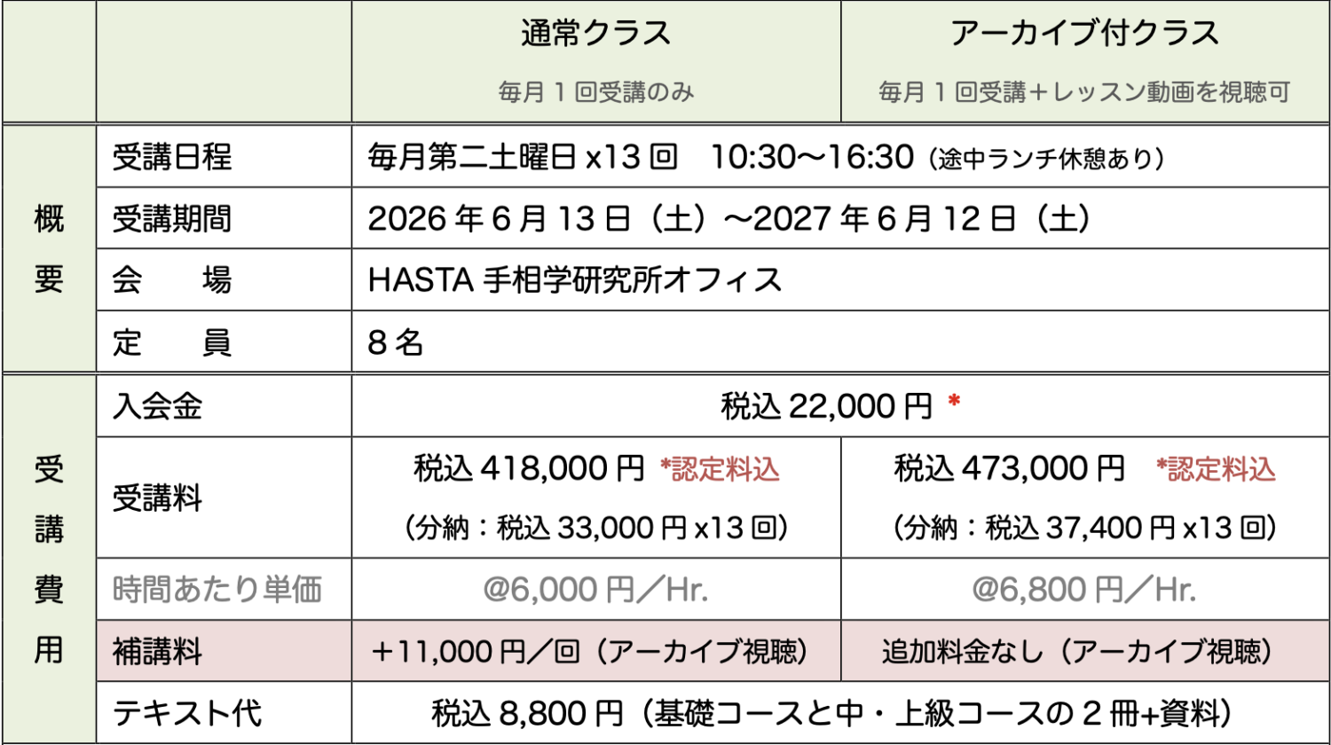 - HASTA公認インストラクターによる”HASTA手相学基礎教室”全課程を修了した方は、入会金免除となります(お申込の際、必ず修了証No.をご入力ください)